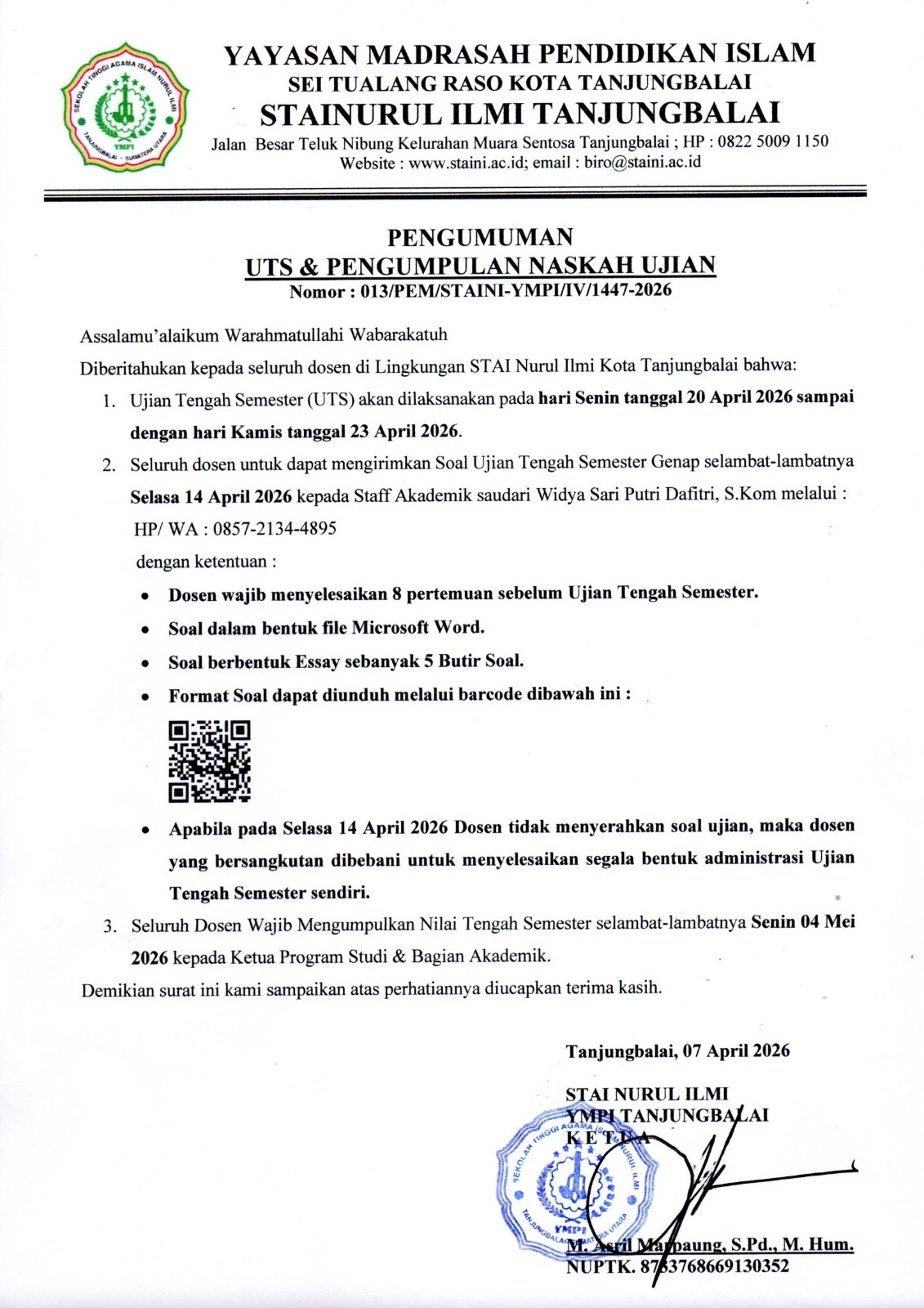 Pengumuman KHATAMAN AL-QURAN DAN BUKA PUASA BERSAMA STAI NURUL ILMI TANJUNGBALAI Read More » 10 Maret 2026 Tidak ada komentar